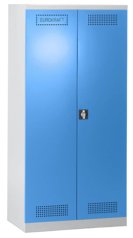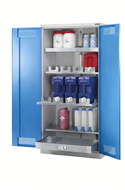 Miljøskap Stig, med uttrekk for beholdere, 5 oppbevaringsnivåer, bredde 950 mm. Vårt eurokraft pro miljøskap muliggjør sikker oppbevaring av kjemiske stoffer. Det robuste metallskapet imponerer med en konstruksjon av høy kvalitet: Skapet er laget av forsterket stålplate, pulverlakkert i lysegrått (korpus) og lyseblått (dører). Skapet kan låses med sylinderlås og tildekket låsekobling, noe som gir maksimal beskyttelse. Miljøskapet eurokraft pro er ideelt for profesjonell oppbevaring av vannforurensende væsker. Med låsbare dører og en effektiv ventilasjonsløsning lagres kjemikalier på en trygg måte.