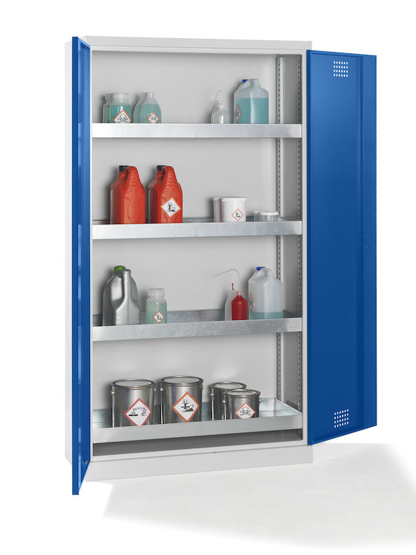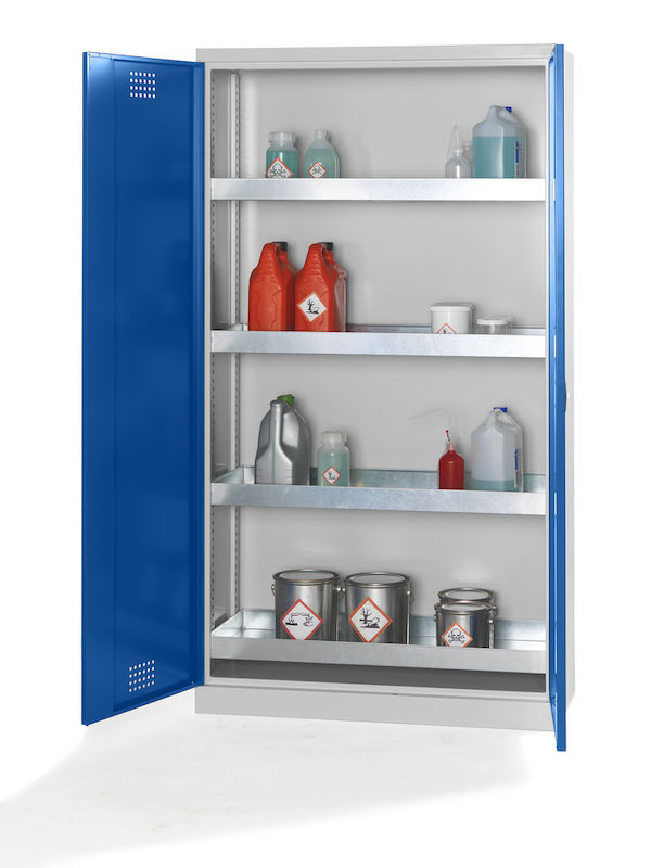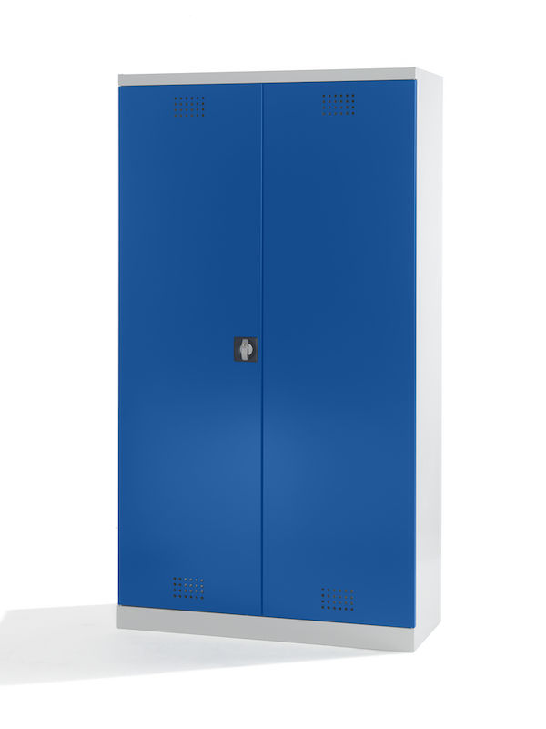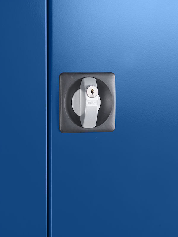 Miljøskap Tom, med 4 karhyller, dører gentianablå. Robust, sveiset og pulverlakkert stålplatekonstruksjon. Stamme i lysegrå RAL 7035.