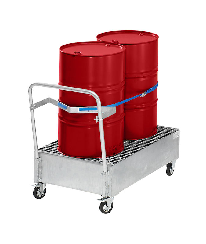 Flyttbart oppsamlingskar i stål Mona, LxB 1200 x 800 mm, 2 x 200-liters fat stående, blå RAL 5012. Godkjent oppsamlingkar av 3 mm tettsveiset stålplate med skyvebøyle. 2 svingbare hjul og 2 faste hjul, Ø 125 mm. Ett svingbart hjul med bremser.