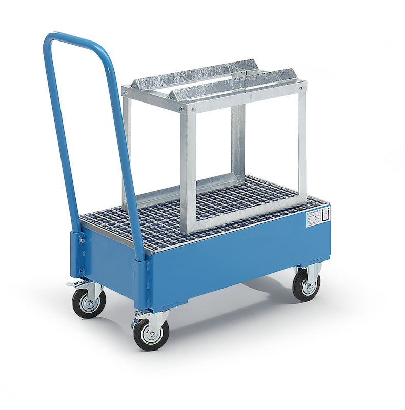 Flyttbart oppsamlingskar i stål Mona, LxB 800 x 500 mm, 1 x 60-liters fat liggende, blå RAL 5012. Godkjent oppsamlingkar av 3 mm tettsveiset stålplate med skyvebøyle. 2 svingbare hjul og 2 faste hjul, Ø 125 mm. Ett svingbart hjul med bremser.