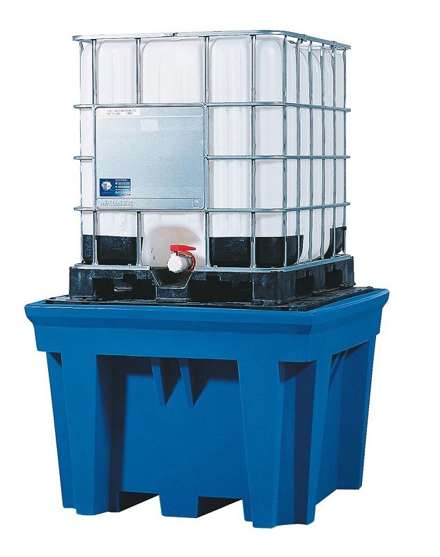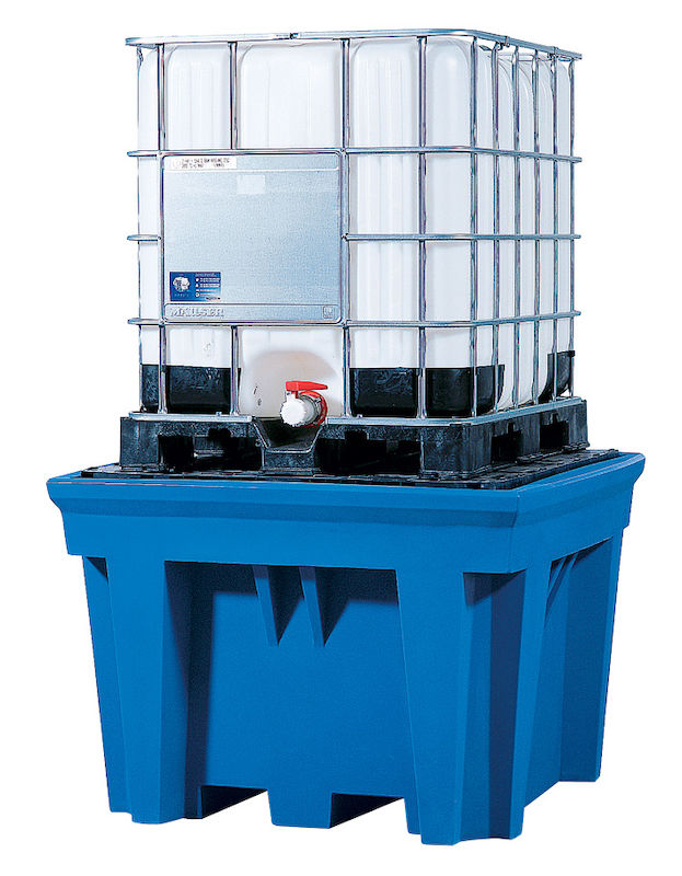 Oppsamlingskar for IBC- og KTC-container, 1100 liter, oppsamlingsvolum 1100 liter, med PE-oppstillingsflater, LxBxH 1430x1430x965 mm. Sikker lagring og avtapping av vannskadende væsker i GHS-kategorier 1 – 4 i IBC og KTC. Alle oppsamlingskar av lett, robust, værbestandig og langlivet polyetylen. Bestandig mot oljer, syrer og lut. Oppsamlingsvolum 1100 liter Integrerte gaffellommer – kan kjøres under med løftevogn og stabletruck. Lastekapasitet per oppstillingsplass maks. 2000 kg (ved fordelt last). Forklaring KTC: Kubisk Tankcontainer IBC: Intermediate Bulk-Container.