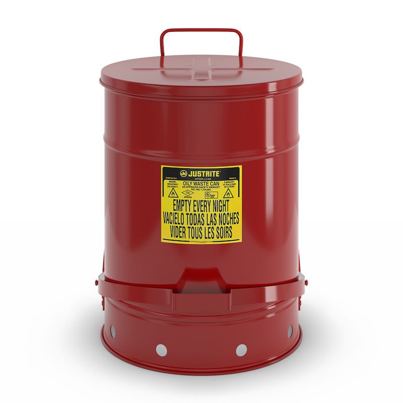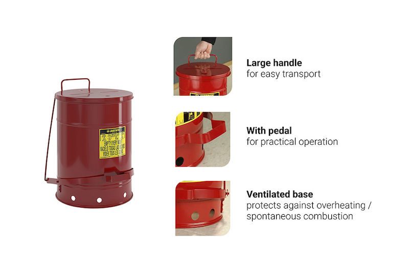Lufteåpningene i bunnen hindrer selvantennelse av innholdet og bidrar til ekstra beskyttelse. Beholderen fås i forskjellige størrelser, slik at den fleksibelt kan integreres i de forskjelligste forskjellige miljøer. Den er kjemisk bestandig mot bensin, diesel og kerosin, og er ideelt egnet til avfallshåndtering av materialer som er dynket i olje, løsemidler eller lim.