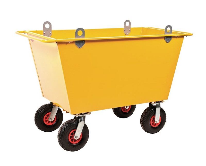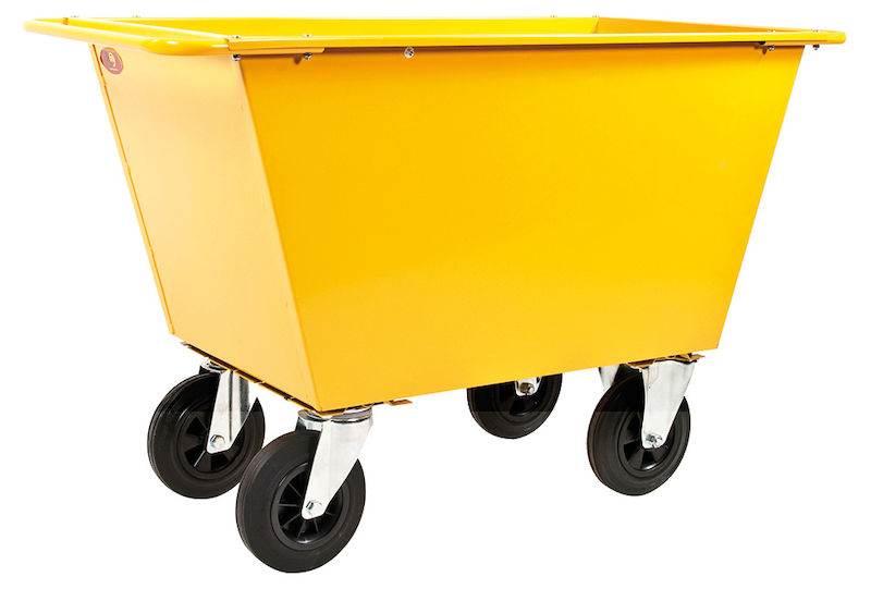 Avfallsvogn, massive gummihjul. Lettstyrt avfallsvogn med 2 faste og 2 svingbare hjul. Finnes i 200, 300 eller 400 liters volum. Fås med eller uten løfteøgler.