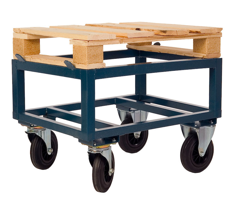 Svenskprodusert pallevogn i topp kvalitet for halvpaller. Utstyrt med støtteklosser på to sider som holder pallen på plass.