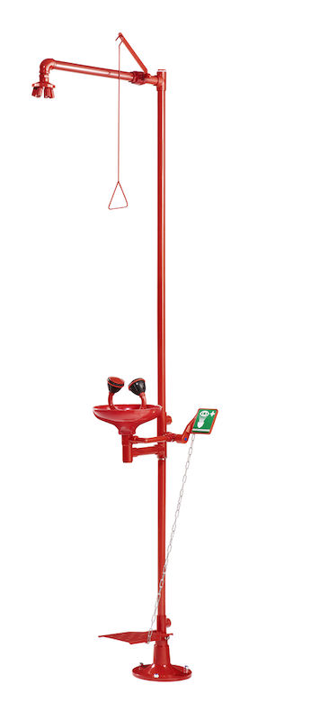 Sikkerhetsdusjer for kropp og øyne Sean, HxD 2230 x 855 mm, rød. Kjemikaliebestandig pulverlakk. Kum, trykkplater, spakledd og støvkapper i robust plast. Plassbesparende kombinasjon av øyedusj og kroppsdusj. Kroppsdusjen betjenes med trekkstang. Øyedusjen kan betjenes ved hjelp av en trykkplate eller pedal. Gummihetter rundt dusjhodene på øyedusjene beskytter mot skader.