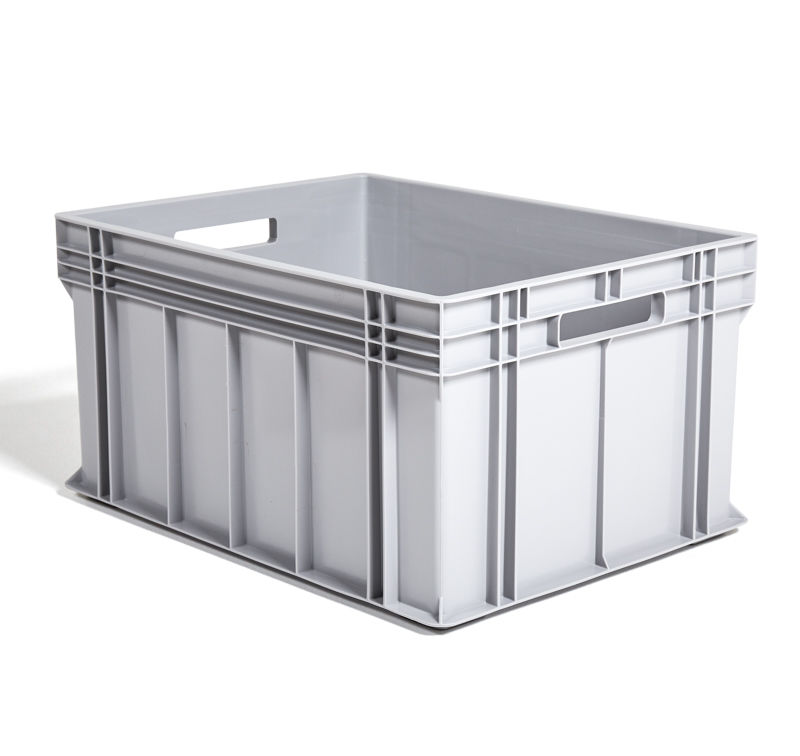 Eurokasse, stablebar, 165l, LxBxH 800x600x415 mm, 10 stk eller flere, næringsmiddelgodkjent. PEHD, grå. Stabelbare plastkasser i euroformat. For alle behov på lageret, i produksjonen eller ved transport. Bestandig mot oljer, fett og de fleste syrer og alkalier (ta kontakt med oss for mer spesifikasjon). Passer for rullebaner og automatisk håndtering. Finnes i to forskjellige utførelser, av næringsmiddelsikker polypropen (PP) som er temperaturbestandig fra –25 °C til +80 °C eller PEHD som er temperaturbestandig fra –35 °C til +60 °C. Begge variantene kan maskinvaskes ved +90°C. Standardutførelse: Bunn flat og heldekkende, sider heldekkende. Gripehull på kortsidene.