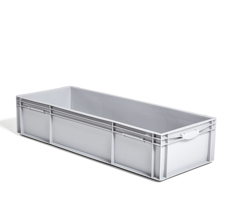 Eurokasse, stablebar, 65l, LxBxH 1000x400x214 mm, 10 stk eller flere, næringsmiddelgodkjent. PP, grå. Stabelbare plastkasser i euroformat. For alle behov på lageret, i produksjonen eller ved transport. Bestandig mot oljer, fett og de fleste syrer og alkalier (ta kontakt med oss for mer spesifikasjon). Passer for rullebaner og automatisk håndtering. Finnes i to forskjellige utførelser, av næringsmiddelsikker polypropen (PP) som er temperaturbestandig fra –25 °C til +80 °C eller PEHD som er temperaturbestandig fra –35 °C til +60 °C. Begge variantene kan maskinvaskes ved +90°C. Standardutførelse: Bunn flat og heldekkende, sider heldekkende. Gripehull på kortsidene.