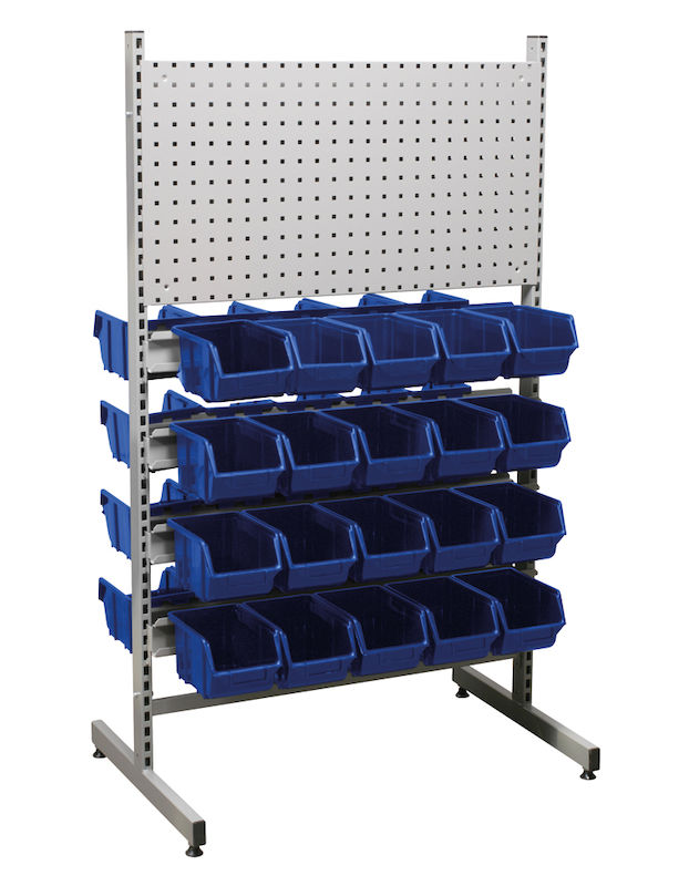 Praktisk verktøystativ med verktøytavle og plastbeholdere for oppbevaring av smådeler. HxB 1500x900 mm. Dobbelstativ leveres komplett med verktøypanel, beholderlister og 40 beholdere. Beholderne måler LxBxH 240x170x125 mm.