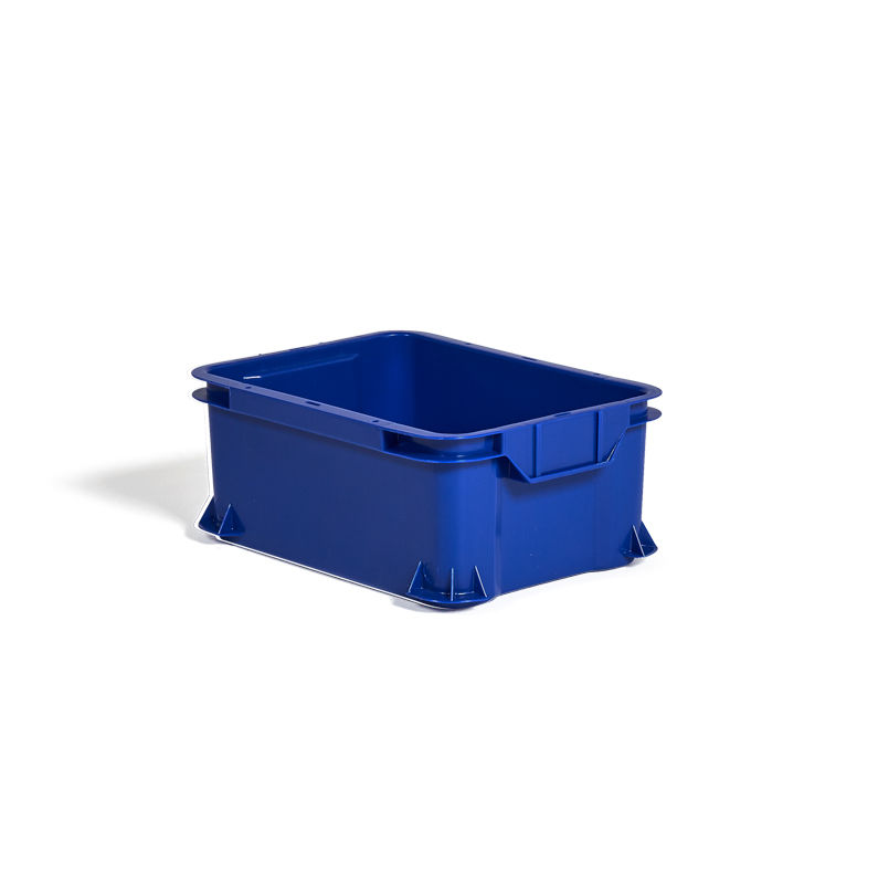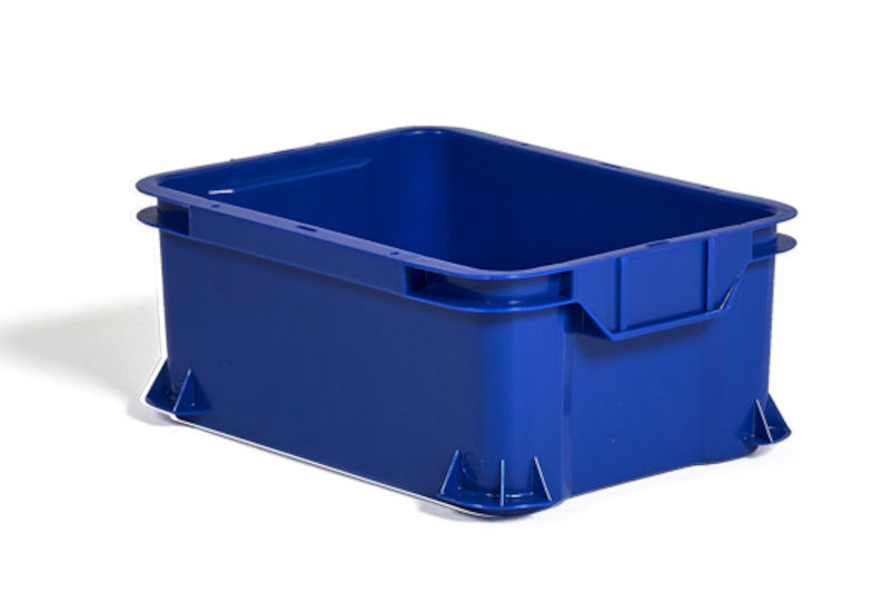 Plastkasse ARCA Uniback, stablebar, volum 14 liter, blå. Laget av HD-polyeten (PEHD) som tåler temperaturer fra -40 til +90 grader celsius. Næringsmiddelgodkjent. Kasser med flat bunnkonstruksjon som tåler alle typer transportbånd. Avrenningshull for oppvaskvann i sargene. Store, kraftige håndtak på utsiden gir godt grep. Luftspalte ved håndtaket hindrer kondens på oppbevart gods ved stabling. Finnes i flere størrelser og farger.