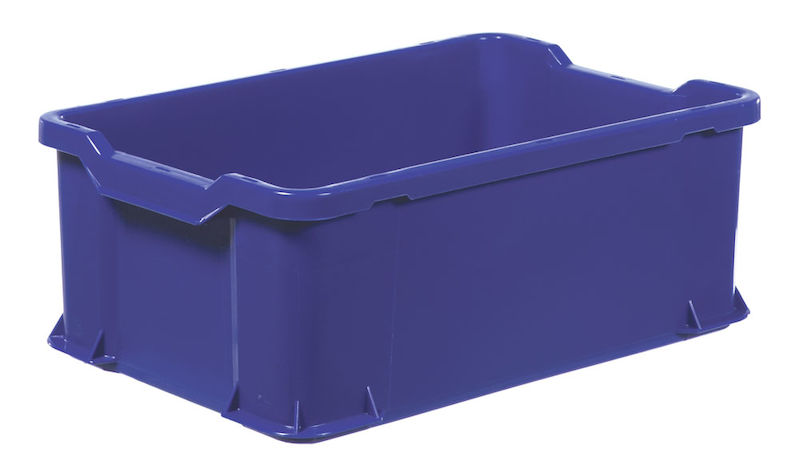 Plastkasse ARCA Uniback, stablebar, volum 40 liter, blå. Laget av HD-polyeten (PEHD) som tåler temperaturer fra -40 til +90 grader celsius. Næringsmiddelgodkjent. Kasser med flat bunnkonstruksjon som tåler alle typer transportbånd. Avrenningshull for oppvaskvann i sargene. Store, kraftige håndtak på utsiden gir godt grep. Luftspalte ved håndtaket hindrer kondens på oppbevart gods ved stabling. Finnes i flere størrelser og farger.