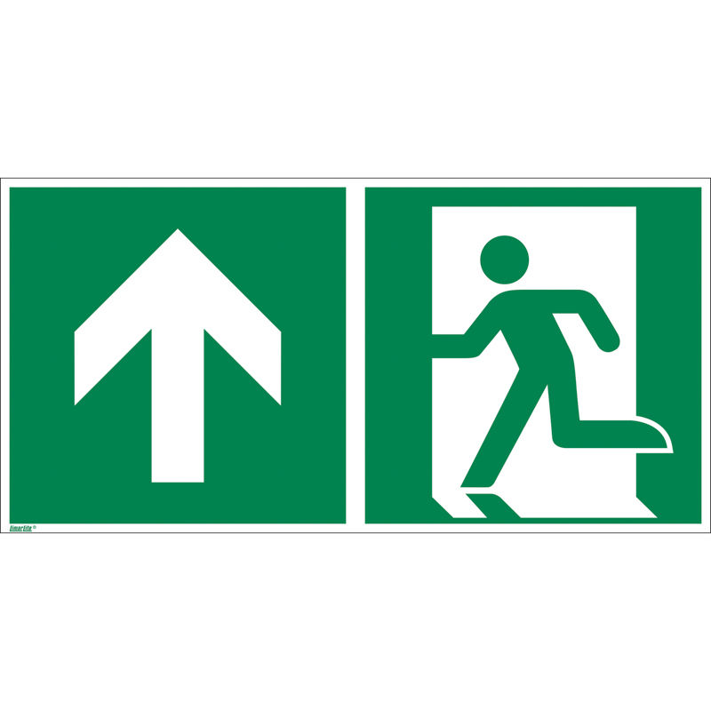 Nødutgangsskilt, etterlysende, oppover, 400x200 mm, aluminium, 10-pk. Etterlysende skilt gir raskt og enkelt informasjon og veiledning ved behov. Skilt i aluminium eller plast. Produsert i henhold til ISO 7010/ASR A3.3. Plasseres godt synlig og etter gjeldende regler. Finnes som enkelt- og dobbeltsidig. Lyskraft 55 mcd/m2, 2 ganger høyere lyskraft enn kravene i henhold til DIN-norm 67510. UV-resistent - for innen- og utendørsbruk. Det etterlysende materialet lyser i mørket efter opplading i dagslys, LED eller annen lyskilde.