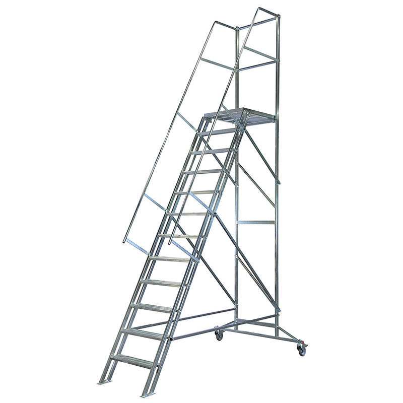 En mobil plattformstige med rekkverk. Beregnet og dimensjonert for håndverk og industri. Trappen har riflede, sklisikre trinn og plattform av lettmetall-profiler. Stammen er produsert av blankforsinkede stålrør.