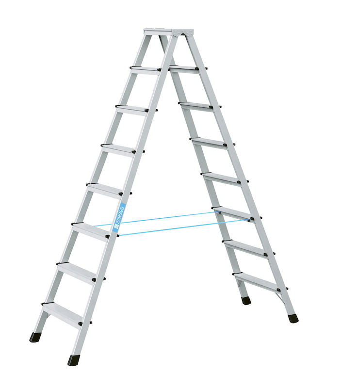 Trappestige, profesjonell, eloksert Torleif, tilgjengelig fra begge sider, 2 x 8 trinn. Trinnforbindelse naglet flere ganger. Trinnendene er utstyrt med plasthetter. Trinndybde 80 mm.