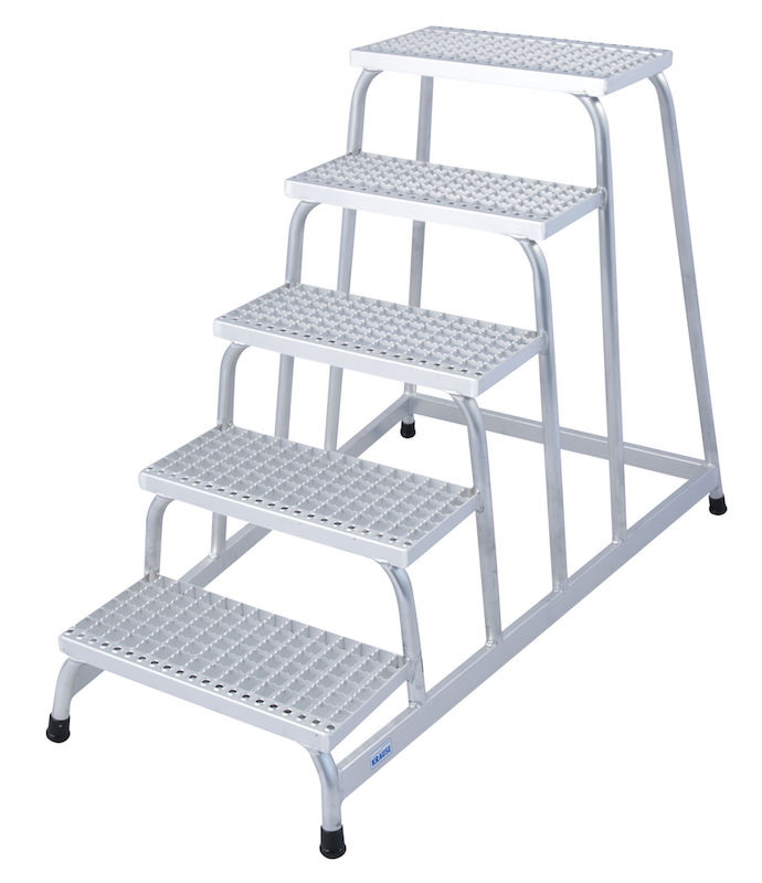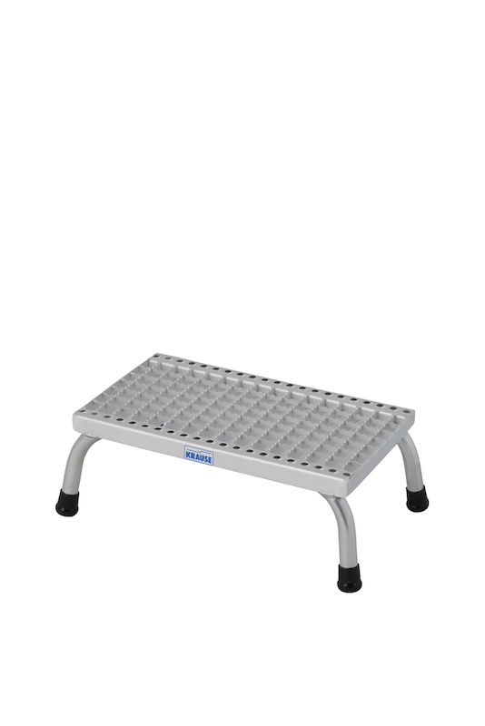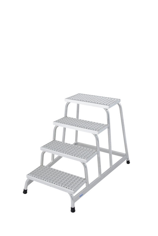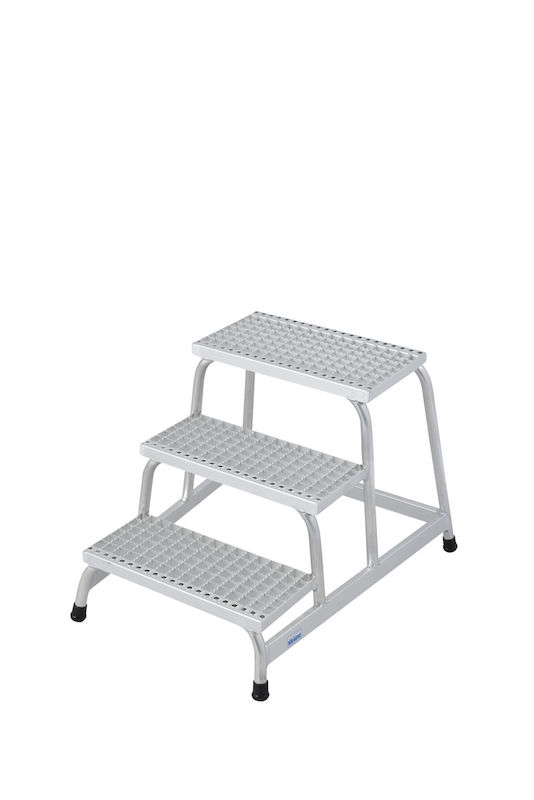 Den stabile podeststigen består av en sveiset aluminiumsrørkonstruksjon og har spesialformede trinnkanter for ekstra grep ved opp- og nedstigning. Sklisikre fotkapsler øker stabiliteten også på glatte gulv. Ideell for bruk i for eksempel verksteder, produksjonsområder eller på byggeplasser.