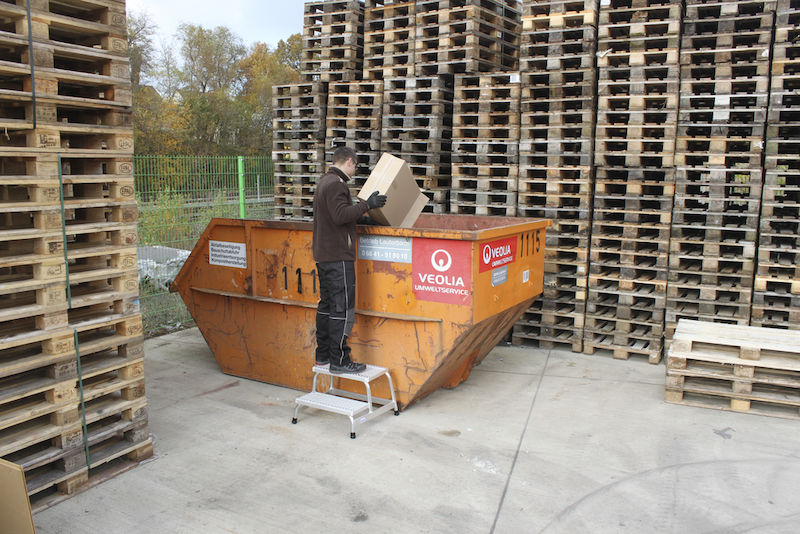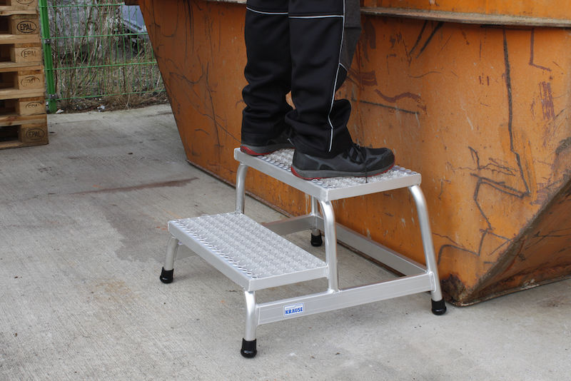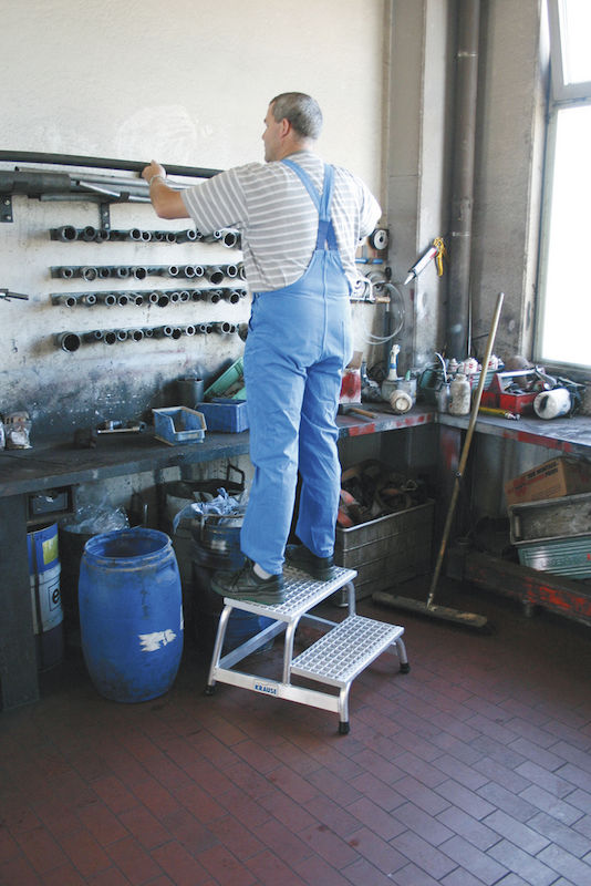 Den stabile podeststigen består av en sveiset aluminiumsrørkonstruksjon og har spesialformede trinnkanter for ekstra grep ved opp- og nedstigning. Sklisikre fotkapsler øker stabiliteten også på glatte gulv. Ideell for bruk i for eksempel verksteder, produksjonsområder eller på byggeplasser.