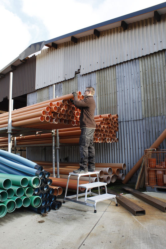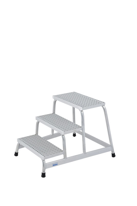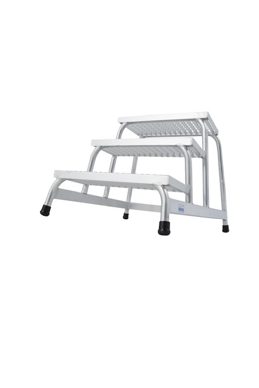 Den stabile podeststigen består av en sveiset aluminiumsrørkonstruksjon og har spesialformede trinnkanter for ekstra grep ved opp- og nedstigning. Sklisikre fotkapsler øker stabiliteten også på glatte gulv. Ideell for bruk i for eksempel verksteder, produksjonsområder eller på byggeplasser.