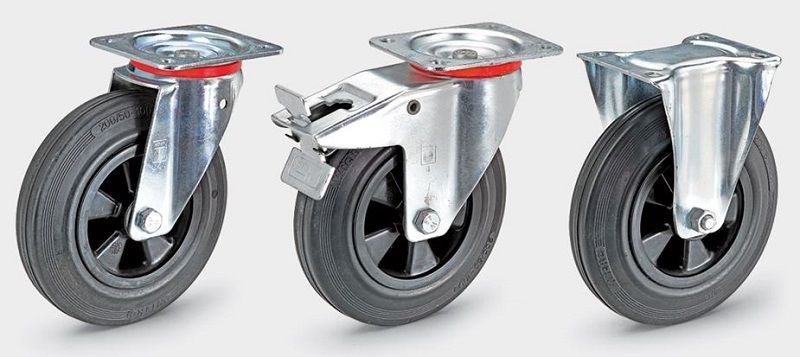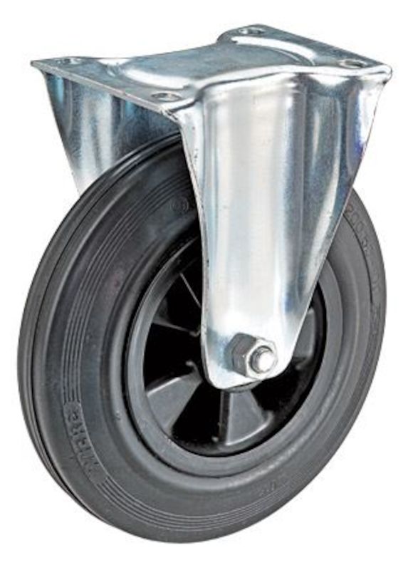 Massivt gummihjul på plastfelg, fast hjul. For enkel til middels belastning. Temperaturbestandig fra -5 °C til +60 °C. Hjulhus av galvanisert, forkrommet stålplate, svinglager med dobbel kulekrans, svinglagerbeskyttelse, rullelager.