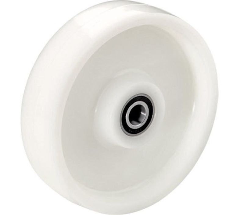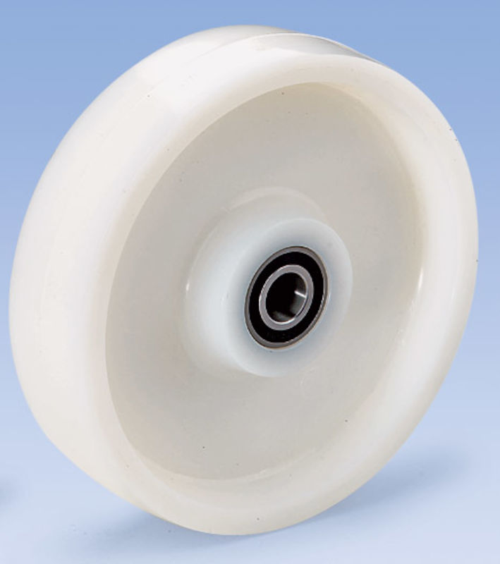 Polyamidhjul, kulelager, hjul Ø x bredde 200 x 50 mm, lastekapasitet 1000 kg. Høy slitestyrke Vidtgående bestandig mot mange fortynnede syrer og lut Temperaturbestandig fra –40 °C til +90 °C. Termoplastisk plast på polyamidbasis.