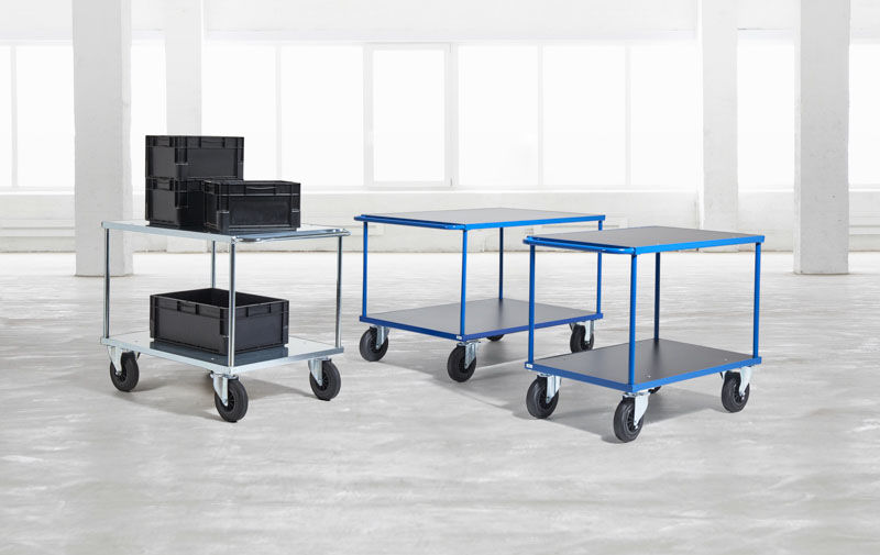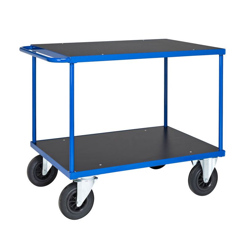 Bordvogn Geran. Bord- og verkstedvogn med kraftig stålramme. Pulverlakkert blå stålstamme med laminathyller, eller forsinket stål med galvaniserte stålhyller. Lastekapasitet 250 kg / hylle. 2 faste og 2 svingbare hjul med eller uten brems. Avstand til første hylle 240 mm, og avstand mellom hyllene 580 mm.