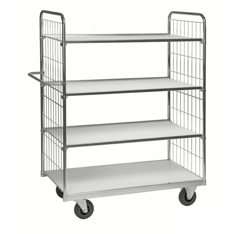 Fleksibel elforsinket hyllevogn med et stort bruksområde. Finnes med 2 eller 4 laminat-hyller. Trinnløst innstillbare hyller. 2 faste og 2 svingbare hjul Ø 160 mm. Lastekapasitet 300 kg. Leveres umontert.