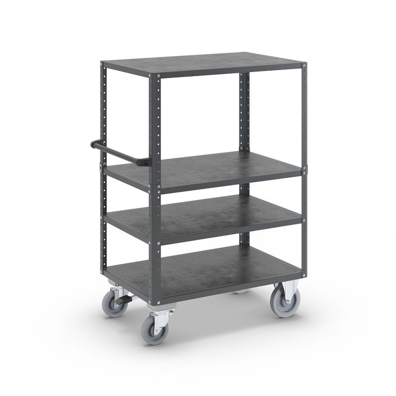 Hyllevogner, åpen på 4 sider CustomLine, 4 hyller, med sentralstopp, antrasittgrå RAL 7016. Hyllevognen eurokraft pro er den perfekte løsningen for de individuelle behovene i industri- og produksjonsbedrifter. Dette innovative produktet, som er en del av vårt allsidige CustomLine-produktsortiment, sørger for fleksibilitet og modularitet takket være ulike kombinasjonsmuligheter og utvidbart tilbehør. Hyllevognen er en pålitelig partner i det daglige arbeidet som tilpasser seg fleksibelt til dine behov og bidrar til å øke effektiviteten i bedriften.