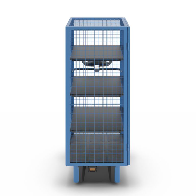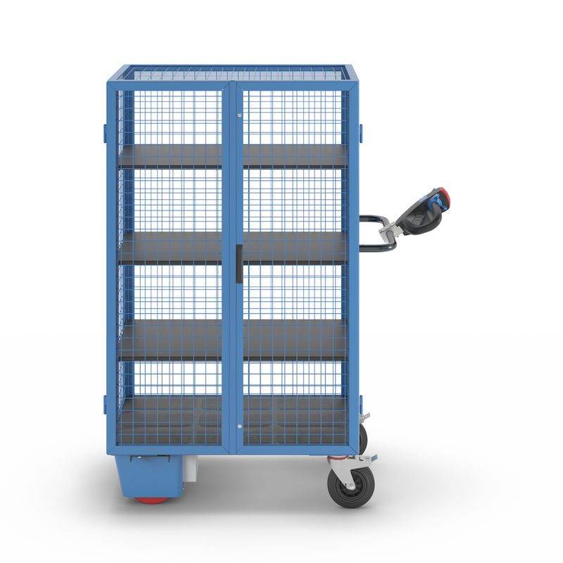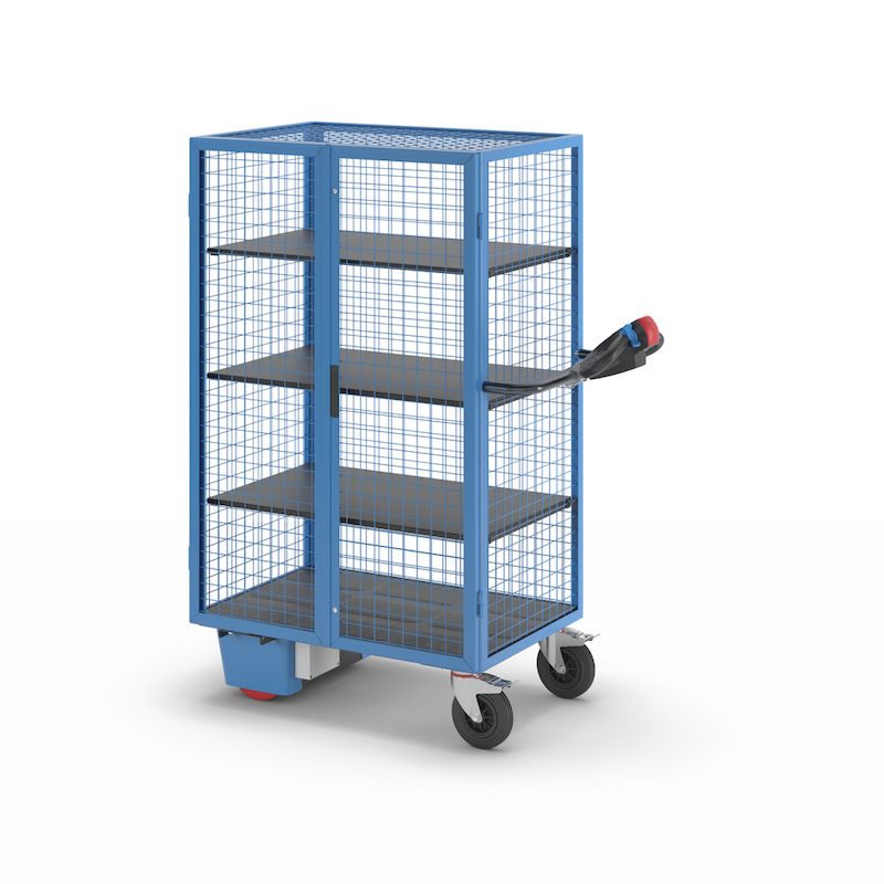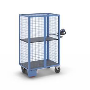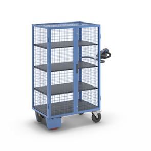 Den elektrisk drevne hyllevognen eurokraft pro imponerer med sin robuste konstruksjon og sitt brede bruksområde. Denne skapvognen er ideell for industrielle bruksområder og muliggjør ryddig lagring, organisering og sikker transport av varer og materialer. Med pulverlakk av høy kvalitet og høydejusterbare lasteflater av svartlakkert MDF er hyllevognen slitesterk og fleksibel i bruk. De ulike versjonene med én til tre hyller eller uten hyller tilbyr løsninger for mange behov. Gitterstrukturen på sideveggene gjør at du til enhver tid kan holde øye med innholdet i vognen og sørger for god luftsirkulasjon. Den sklisikre bunnplaten, som er laget av resirkulert plast, gir trygg og stabil oppbevaring. Den er olje- og syrebestandig samt værbestandig. De svingbare hjulene med doble stoppere gir sikkerhet når vognen parkeres.