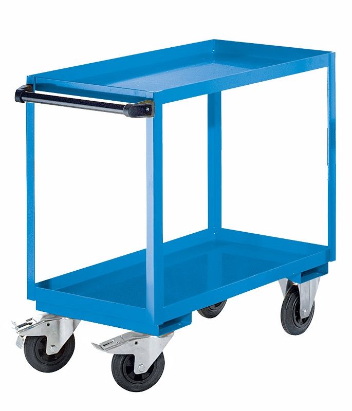 Rullebord Alsis med 2 hyller, lastekapasitet 250 kg, lasteflate LxB 900 x 500 mm, totalhøyde 915 mm, blå (RAL 5012). Med vanntette trauhyller med 40 mm høye kanter. Pulverlakkert.