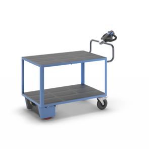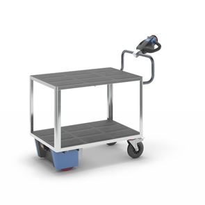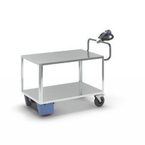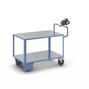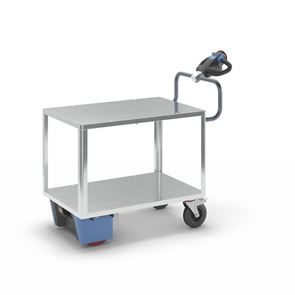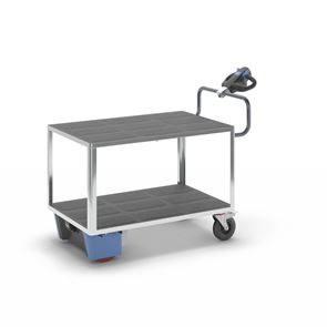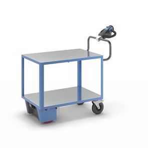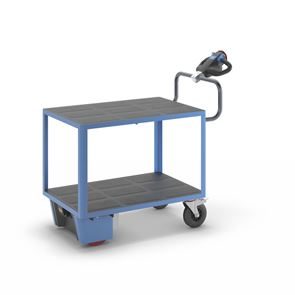 Verstedvogner med elektrisk drift Edessa, 2 hyller i plast, LxBxH 1470 x 700 x 1300 mm blå. Vår høytytende NEO e-modul allerede kombinert med vår verkstedvogn. Klar til bruk.