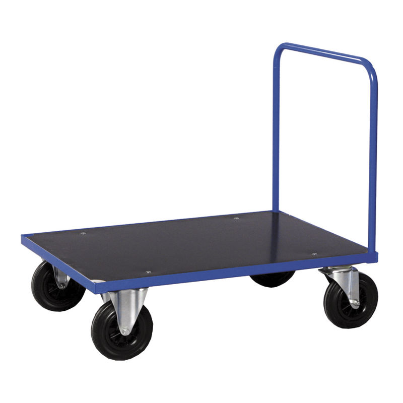 Plattformvogn Uvan, LxBxH 1000x700x260 mm, blå, med skyvebøyle. Plattformvogner med lastekapasitet 500 kg. Kraftig pulverlakkert stålkonstruksjon med laminert lasteflate, vegger i laminat eller gitter. Gavler og sider er avtagbare. 2 faste og 2 svingbare hjul, diameter 200 mm.