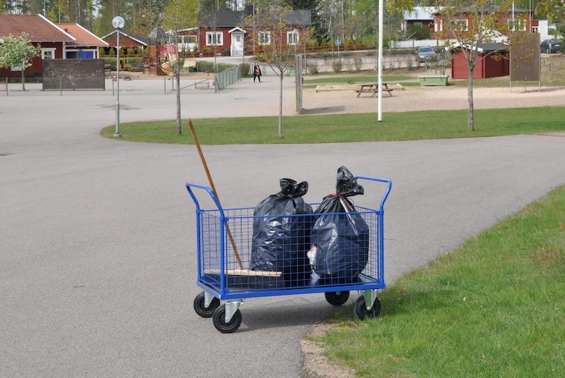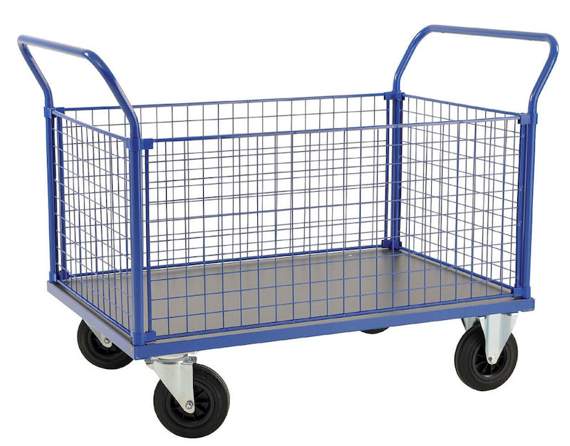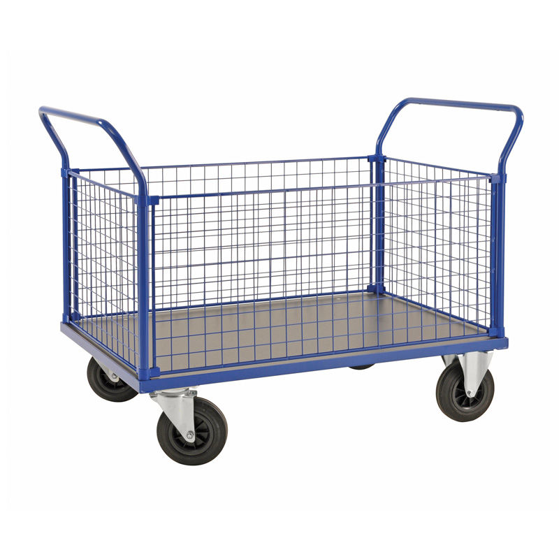 Plattformvogn Uvan med gitter, LxBxH 1366x800x1020 mm, blå, 4 vegger. Plattformvogner med lastekapasitet 500 kg. Kraftig pulverlakkert stålkonstruksjon med laminert lasteflate, vegger i laminat eller gitter. Gavler og sider er avtagbare. 2 faste og 2 svingbare hjul, diameter 200 mm.