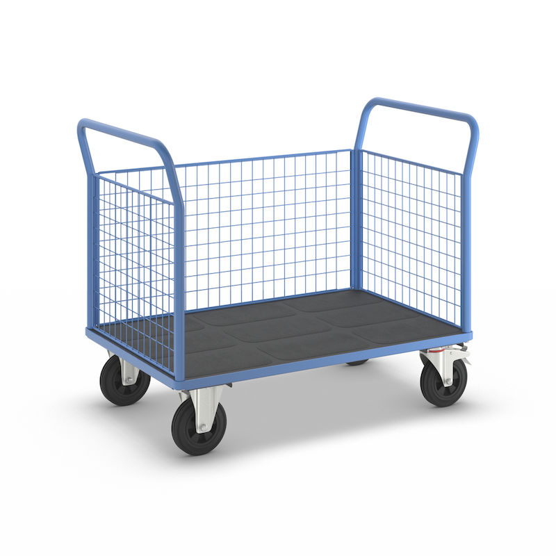 Plattformvogner Lorena, med 1 gittersidevegg, 2 gittervegger kortside, LxB 1250 x 800 mm, massive gummihjul. Pulverlakkert stålkonstruksjon, lyseblå RAL 5012 som standard. Sidevegger av stålnett, maskestørrelse 50 x 50 mm. Lastehøyde 280 mm. Høyde på skyvehåndtak 1100 mm.