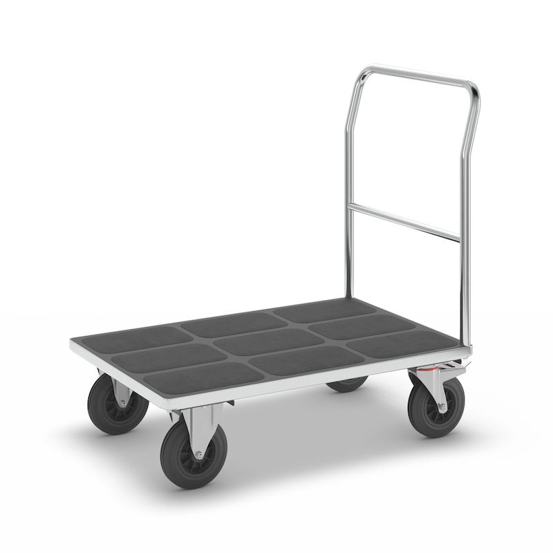 Plattformvogner Lorena, rørskyvebøyle, massive gummihjul, LxB 1050 x 700 mm, galvanisert. Pulverlakkert ramme og skyvebøyle av høy kvalitet. Komfortabel lastehøyde på 280 mm og høyde på skyvehåndtaket på 1100 mm.