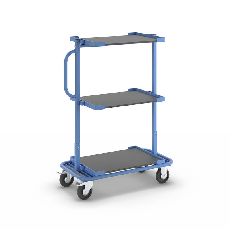 Plukkvogner Liam, med 3 løse hylleplater, lastekapasitet 200 kg. Pulverlakkert stålkonstruksjon, standard lyseblå RAL 5012.