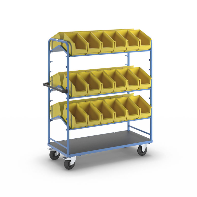 Plukkvogner Loana, LxBxH 1500 x 650 x 1750 mm, lastekapasitet 300 kg. Pulverlakkert stålkonstruksjon, lyseblå RAL 5012 som standard. Ideell for transport og ordreplukking.