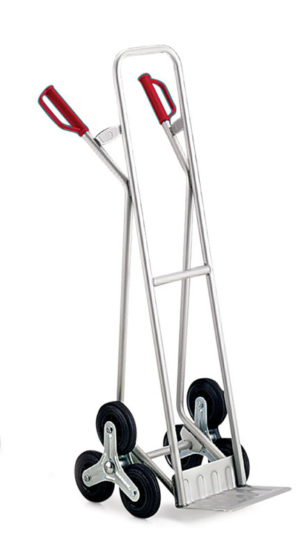 Trappetralle i aluminium, lasteplate 280x185 mm, til bruk i trapper, over terskler og kantstein. Stativ i sveiset aluminiumsrørkonstruksjon, eloksert, rustfri, ca. 30 % lettere enn stålrør. Med fast, riflet lasteplate av aluminium. Elokserte aluminiumsrør – farger ikke av – blir ikke grå – forblir rene og pene. Stjernehjulkonstruksjon overvinner uten problemer inntil 200 mm høye trinn. Massive gummihjul med glidelager.