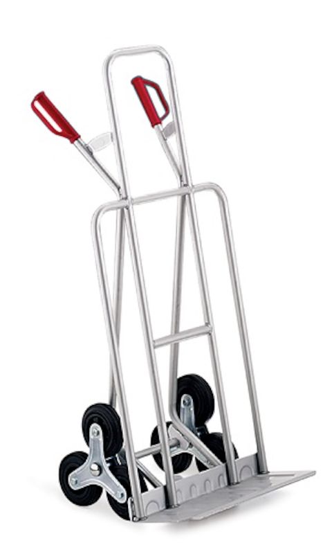 Trappetralle i aluminium, lasteplate 550x220 mm, til bruk i trapper, over terskler og kantstein. Stativ i sveiset aluminiumsrørkonstruksjon, eloksert, rustfri, ca. 30 % lettere enn stålrør. Med fast, riflet lasteplate av aluminium. Elokserte aluminiumsrør – farger ikke av – blir ikke grå – forblir rene og pene. Stjernehjulkonstruksjon overvinner uten problemer inntil 200 mm høye trinn. Massive gummihjul med glidelager.
