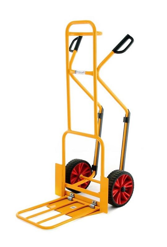 Trappetralle med glideskinner, maks. last 200 kg, punkteringsfrie hjul. Stabil trappetralle i helsveiset stålkonstruksjon. Håndtakene har knokebeskyttelse. Ekstra håndtak øverst for sikrere grep i trapper. Med utfellbart lasteplan BxD 360 x 500 mm. Lastekniv 430 x 200 mm. Punkteringsfrie hjul av massiv helstøpt polyuretan, som gir myk gange.