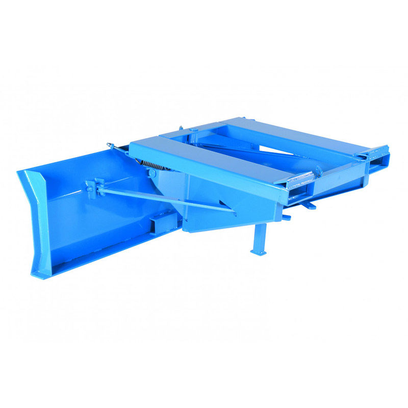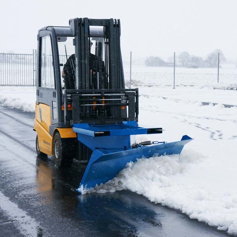 Kraftig snøplog, lettmontert på truck, B 1500 mm. Plogen er utstyrt med støtteben og åpne gaffeltuneller (beskytter truckstativet). Fjærende plogblader i 8 mm stålplate med kraftige forsterkninger, nedre kant med slitestål. Bladet kan stilles i 3 stillinger: 30° venstre, 30° høyre og rett frem. Høyde 600, lengde 1400 mm.