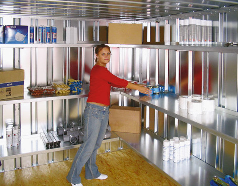 Hyllesystem til utstyrscontainer Totak. Praktisk hyllesystem med 3 hylleplater. Vegghylle som monteres på frittstående stolper mot containerveggen. Frigjør hele gulvflaten. Hylleplatene er flyttbare med 100 mm intervaller. Produsert av forsinket stål.