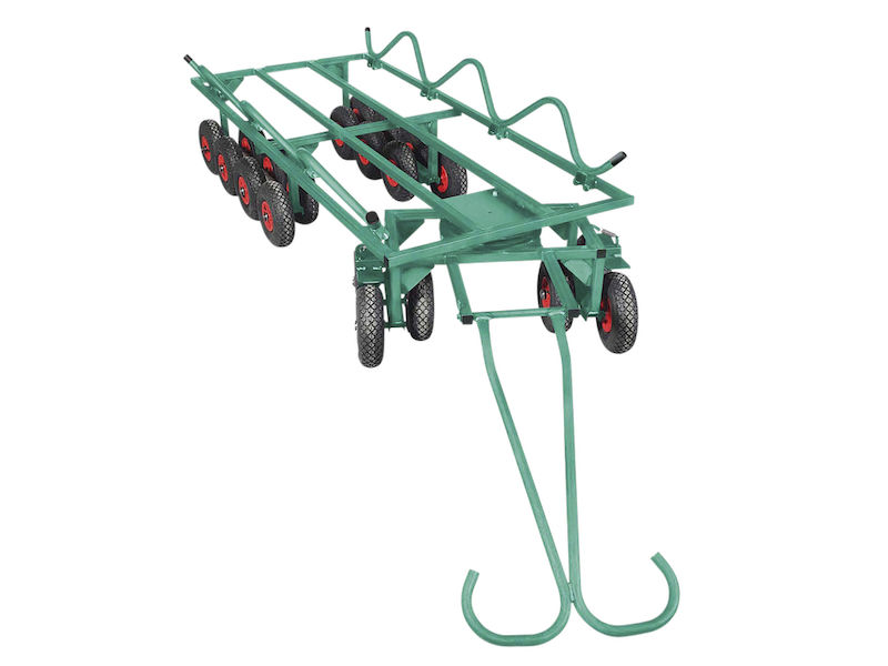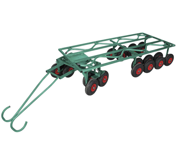 Med 20 hjul som er forskjøvet anordnet, sørger den robuste håndtrallen for jevn lastfordeling og høy stabilitet. Luftgummihjulene garanterer jevn kjøring, selv med tung last. Alternativt er det tilgjengelig punkteringsfrie PU-dekk. Den romslige lasteflaten på 1900 x 850 mm gir god plass til plater, rør eller profiler. Den pulverlakkerte overflaten beskytter pålitelig mot korrosjon og slitasje. En integrert fotbrems gjør det mulig å parkere transporttrallen sikkert, også i skråninger.