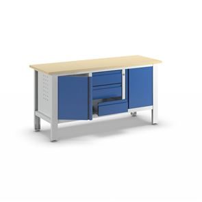 Arbeidsbenk Edmund, 3 skuffer, 1 åpent rom med hylle, BxD 1200 x 600 mm. Robust, pulverlakkert stålkonstruksjon. Stamme i lysegrå RAL 7035, fronter i ensianblå RAL 5010.