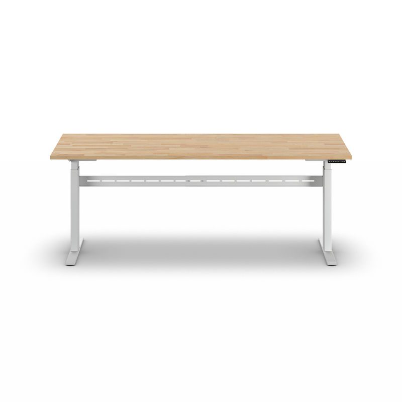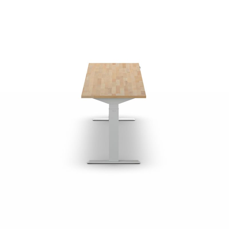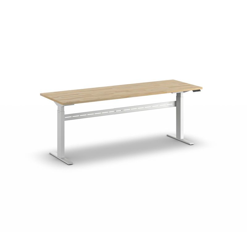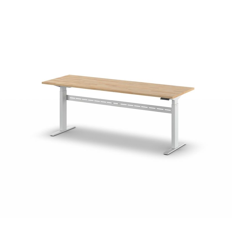 Arbeidsbord, elektrisk, høydejuseterbart, lastekapasitet 300 kg Fideli, høyde 740 – 1195 mm, massiv bøkeplate, BxD 2000 x 700 mm. Det elektrisk høydejusterbare arbeidsbordet kombinerer fleksibilitet og ergonomi for arbeidsmiljøet ditt. Bordet gjør det enkelt å veksle mellom sittende og stående stilling, noe som gir en sunn arbeidsmåte og reduserer belastningsrelaterte ryggsmerter.