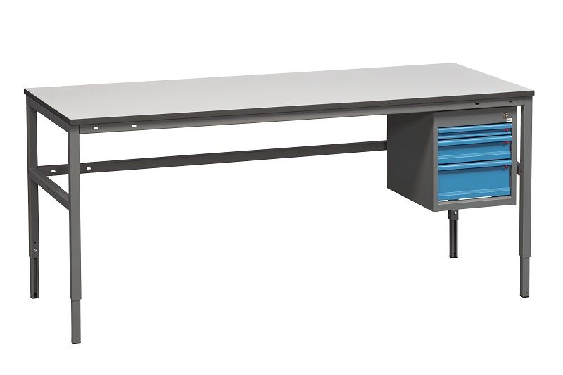 Komplett arbeidsbord med oppbevaringsskuffeseksjon med 3 skuffer, 435x385x500 mm. Svært stabil konstruksjon med kraftige profilrør, 40x40 mm, i grå pulverlakk. Bordet er komplett med 3 tverrstag som forbinder H-stativet, noe som øker stabiliteten ytterligere. Bordplatene er 24 mm tykke, i lysegrå høytrykkslaminat eller limt grå vinyl. Grafittgrå kantlister til alle bordplater.