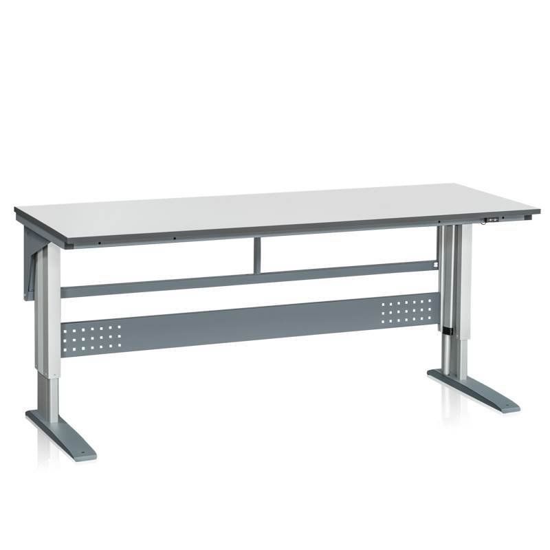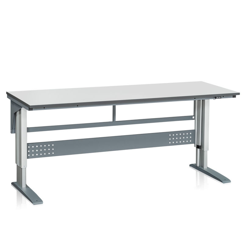 Hev og senk arbeidsbord Vestre, 2000x800 mm, grå laminatplate. Elektrisk justerbart arbeidsbord med søyler av aluminium og stativ i pulverlakkert stål. Leveres komplett med grå laminatplate. Bordplaten har avrundede og fasede kanter med en kantlist av ABS-plast. Elektrisk justerbart med trykknapp, intervall 690-1180 mm. Maks belastning 375 kg utbredd last. Leveres komplett med påbyggingsramme.