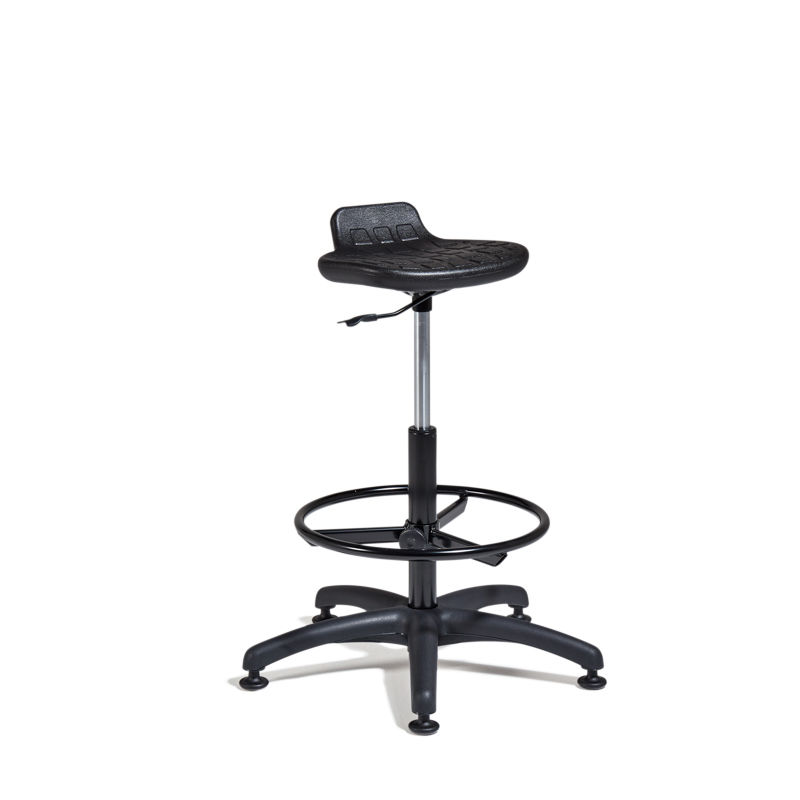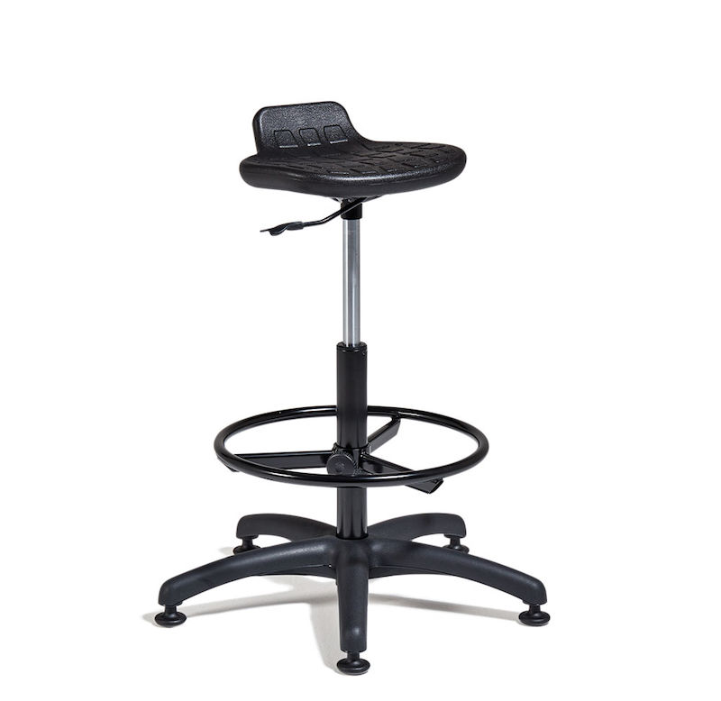 Ståstol Maia. Ståstol med sete i PU-skum som tåler mange ulike væsker og kjemikalier, lett å rengjøre. En stabil hev og senk ståstol med enkel og funksjonell mekanisme. Setet har korsryggstøtte. Leveres med glidefot og fotring.