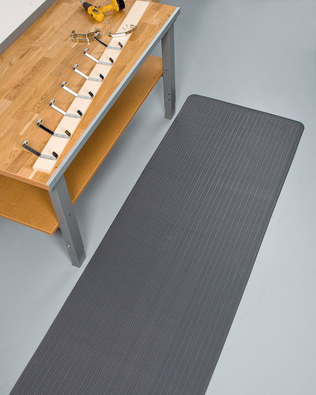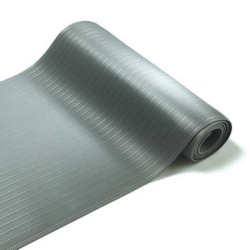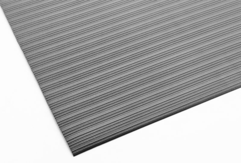 Arbeidsmatte Senso Ribb, B 610, per løpemeter, helgrå. Helstøpt, 9 mm tykk matte av vinyl for tørre miljøer. Behagelig overflate med svikt og god sklisikring. Lett å tilpasse selv med vanlig teppekniv.