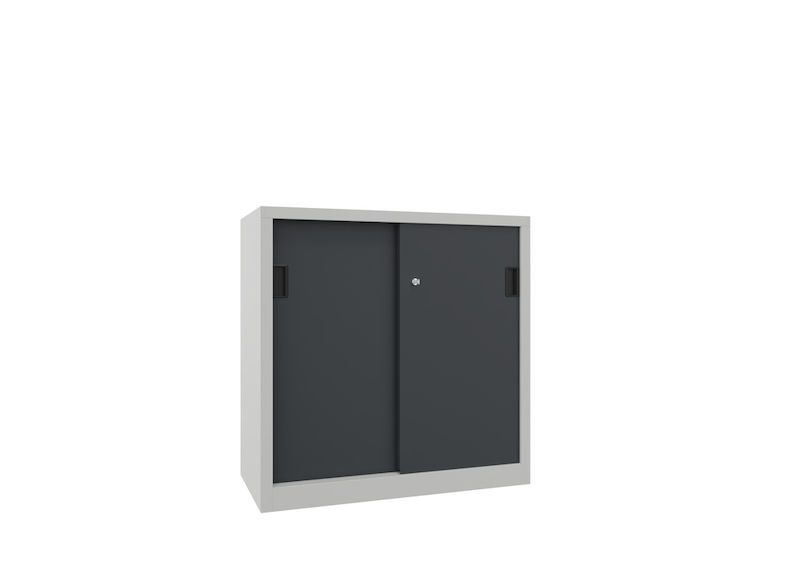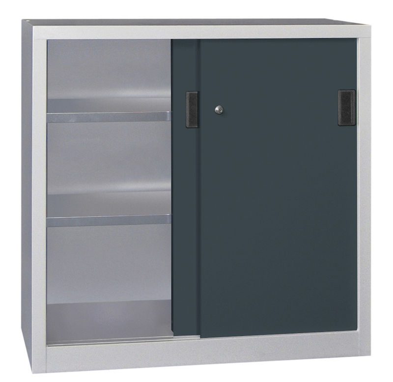 Stålskap med skyvedører Ellinor, høyde 1000 mm, dører i hel platestål, BxD 1000 x 400 mm, med 2 hylleplater, dør antrasitt.