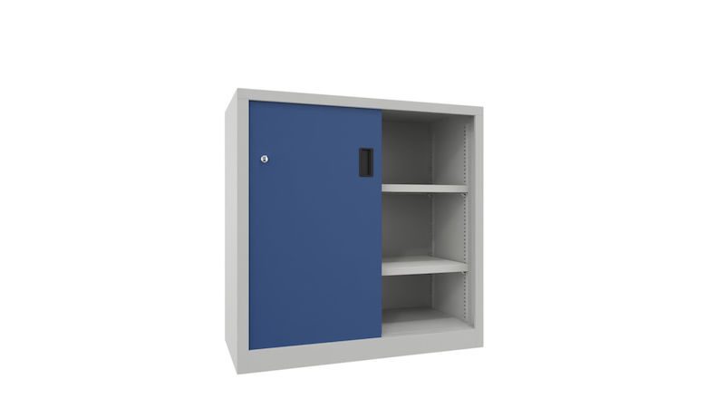 Stålskap med skyvedører Ellinor, høyde 1000 mm, dører i hel platestål, BxD 1000 x 500 mm, med 2 hylleplater, dør gentianablå.