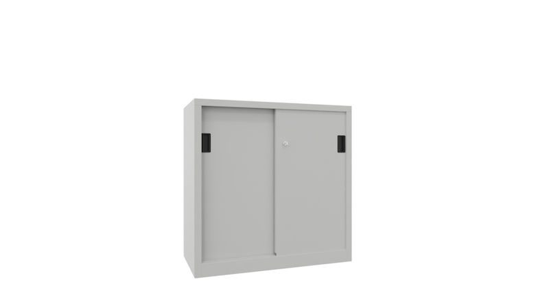 Stålskap med skyvedører Ellinor, høyde 1000 mm, dører i hel platestål, BxD 1000 x 600 mm, med 2 hylleplater, dør lysegrå.