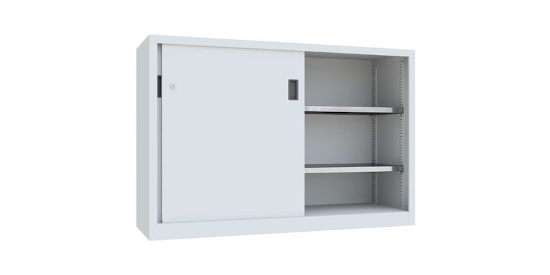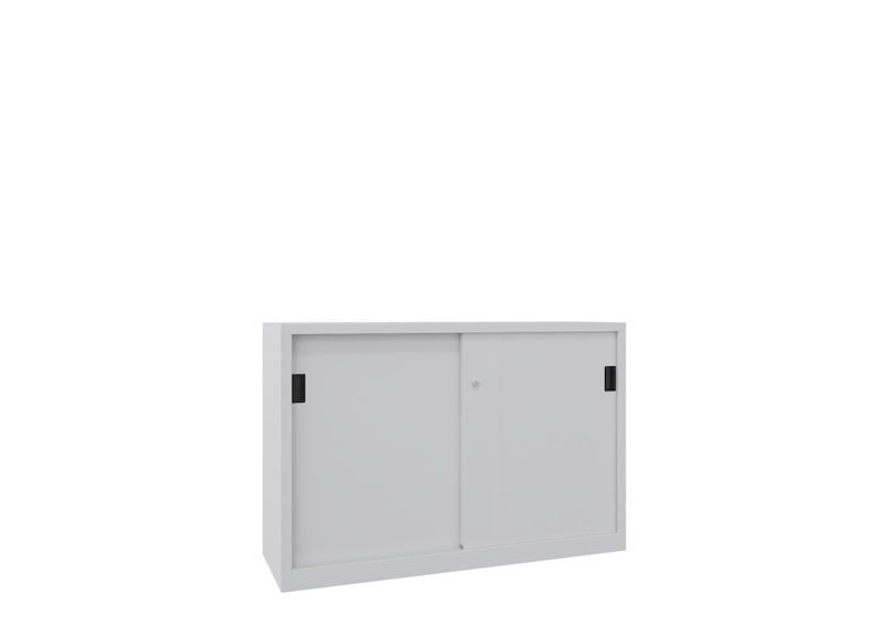 Stålskap med skyvedører Ellinor, høyde 1000 mm, dører i hel platestål, BxD 1500 x 500 mm, med skillevegg og 2 x 2 hylleplater, dør lysegrå.